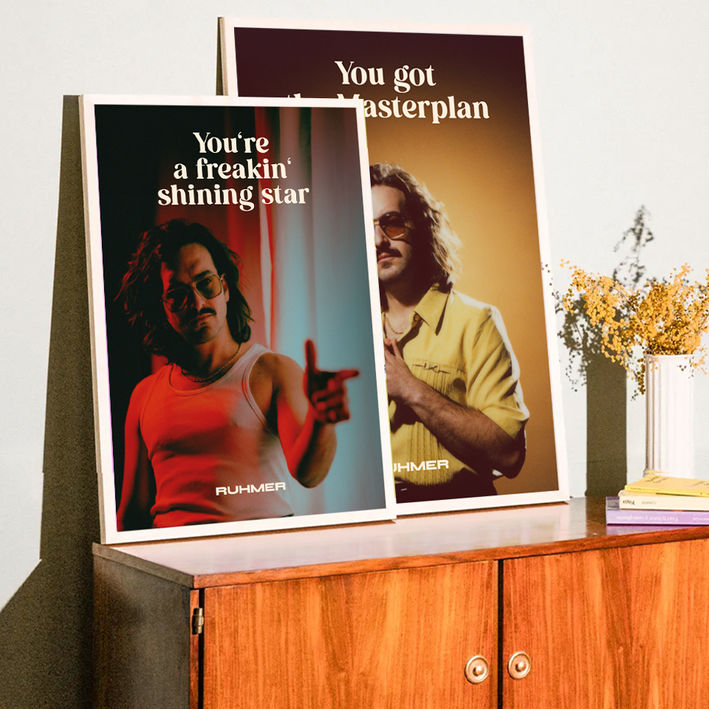 RUHMER’s style draws from a world of retro vibes, analog warmth, and cinematic aesthetics. Musically, he blends indie pop, soul, and classic rock – marked by emotional depth, vintage textures, and a strong sense of identity. Visually, his appearance mirrors the sound: inspired by 70s and 80s references, vintage eyewear, and bold styling.
